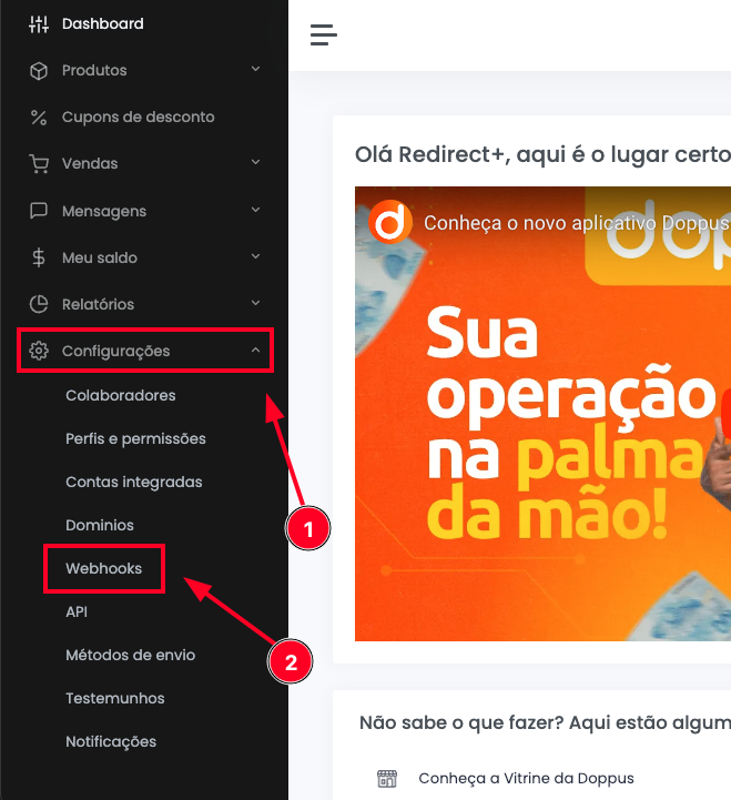 Abra o seu painel na Doppus e clique em **Configurações (1)** no menu lateral e clique em **Webhooks (2)**.